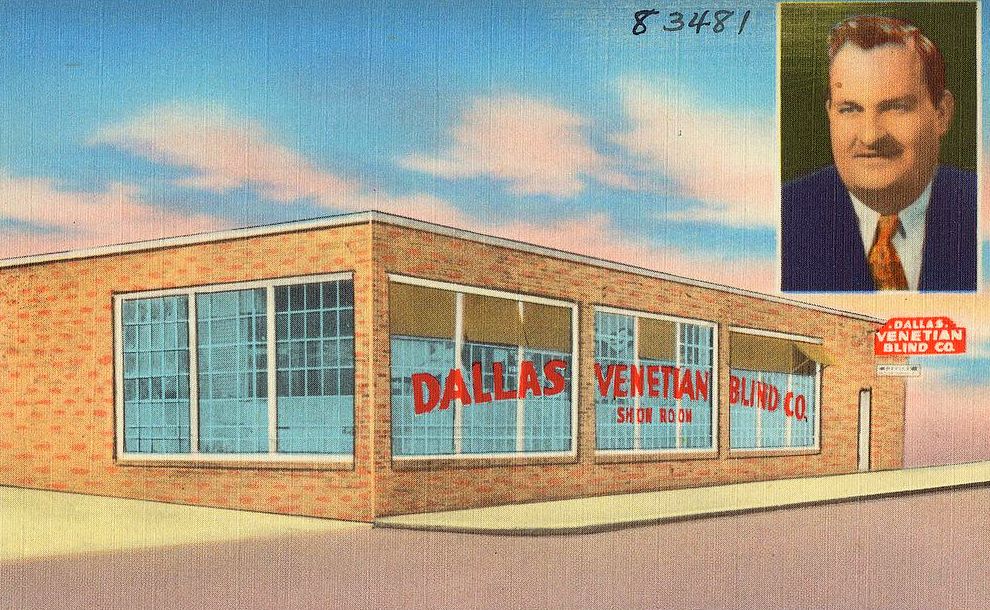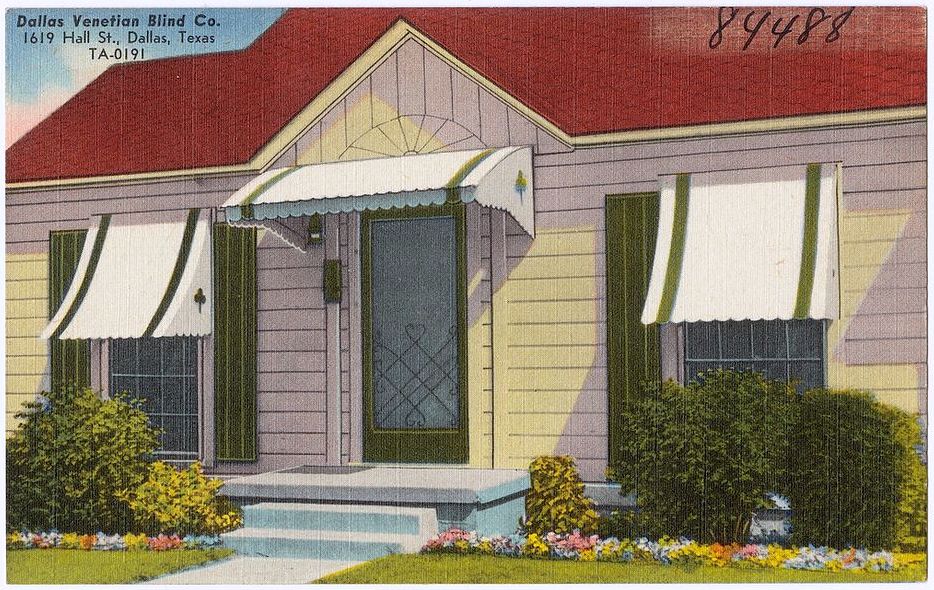 This is the sort of old postcard I love. It shows an impossibly idealized version of the past. This lovely house, with its impeccably manicured lawn and bright, shiny awnings is not a home, but the location of a business. It’s the Dallas Venetian Blind Company, at 1619 Hall Street, a few steps from Ross Avenue. When I see old postcards and photographs of places like this, I always wonder about the people who lived and worked there. So who went to work every day in that cute little house, living and breathing all-things Venetian blinds?