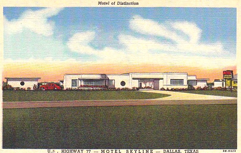 The “Motel Skyline” (or “Skyline Motel” as it was being referred to in ads not long after it opened in September, 1947) was located at 6833 Harry Hines, near West Mockingbird, just past Love Field. It’s not a great neighborhood these days, but perhaps it was better 60-some-odd years ago, when Harry Hines was the route that the old Hwy. 77 followed. The 30-unit “motor hotel” was built at a cost of $250,000 — it boasted year-round air conditioning and “mattresses of fiberglass.”