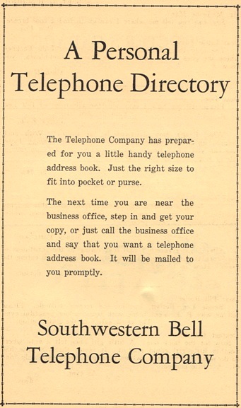 The relatively few telephone subscribers at the time the building was going up might explain this folksy little notice about a “personal telephone directory” that the fine folks at Southwestern Bell have been working on night and day, just for you. Next time you’re in the neighborhood, why don’t you just drop right on in and pick one up? Set a spell. Take your shoes off. Y’hear?