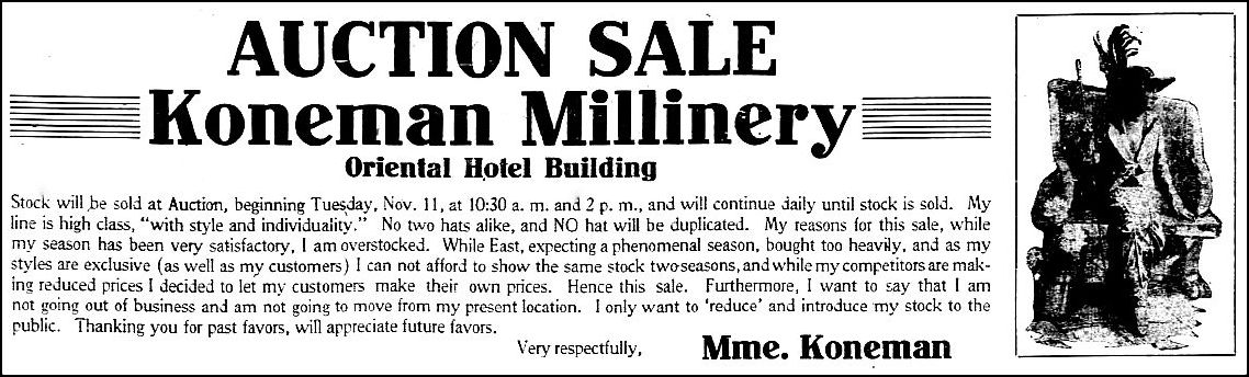 Behold, the Koneman Millinery Establishment, which actually looks a little plain for a millinery shop housed in the ornate Oriental Hotel building. When I see old ads or photos like this, I always wonder about the people pictured in them. I’m assuming that the woman in the oval inset at the left was the proprietess, “Mme. Koneman.” So who WAS she, this woman who had a “high-class” business that catered to a “high-class” clientele? I poked around a little and found these ads from 1913.