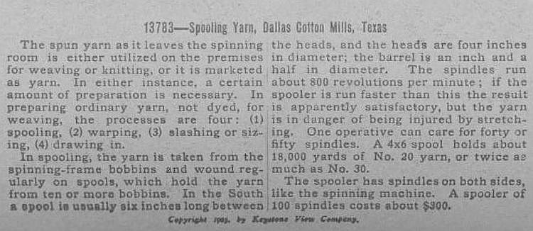 Photo (“Spooling Yarn, Dallas Cotton Mills, Dallas, Texas”) is from a stereograph, circa 1905, from the Lawrence T. Jones III Texas Photographs Collection, DeGolyer Library, Central University Libraries, Southern Methodist University; it is accessible here.