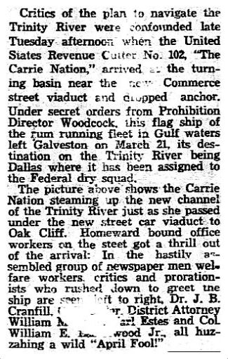 Below is the accompanying story about the United States Revenue Cutter Carrie Nation and the news of its journey up a surprisingly navigable Trinity River in order to anchor itself beneath the Commerce Street viaduct and make sure that the rum-runners in the Gulf don’t gain a foothold in bone-dry Prohibition-era Dallas. The photo and report appeared in the pages of The Dallas Morning News on April 1, 1931, beneath the headline “Lots of Dallas People Failed to See This.”