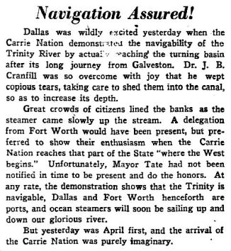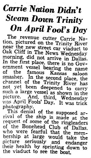 […] “US Revenue Cutter ‘Carrie Nation’ Successfully Navigates the Trinity In Valiant E… An extremely clever April Fool’s Day prank pulled by The Dallas Morning News, suggested by the notorious Bonehead Club of Dallas. There are so many great elements to the story, including a pretty funny photo manipulation. […]