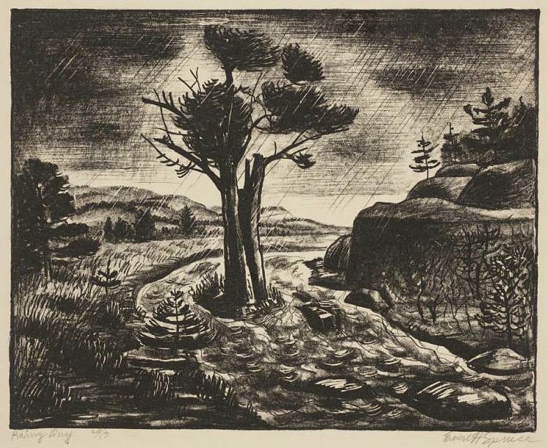 Two works by local artists closely connected with (if not actually IN) the influential Dallas Nine group of painters and printmakers. Both works are titled “Rainy Day.”