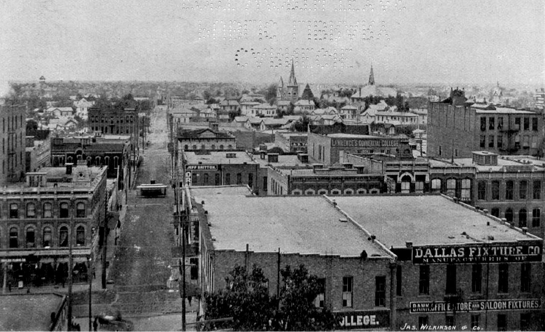 I think this photo was taken from several floors up in the Oriental Hotel, which was on the southeast corner of the intersection of Commerce and Akard. Akard has an offset around the hotel where it crosses Commerce and from the hotel one could have seen straight up Akard to the north. The trolley is, I think, on Elm, and Main is seen across the middle of the photo.