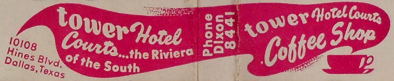 The Tower Hotel Courts opened in the fall of 1946. Their address makes my had spin: at “The Circle” where highways 77, 183, 114, and Loop 12 intersect. “10108 Harry Hines” would have been easier to fit on the stationery, but mention of all those highways just made everything more exciting. (It also gave some indication to prospective guests of what would be awaiting them, such as constant traffic noise and the ever-present whiff of exhaust in the air. “You can’t say we didn’t warn you, madam.”)