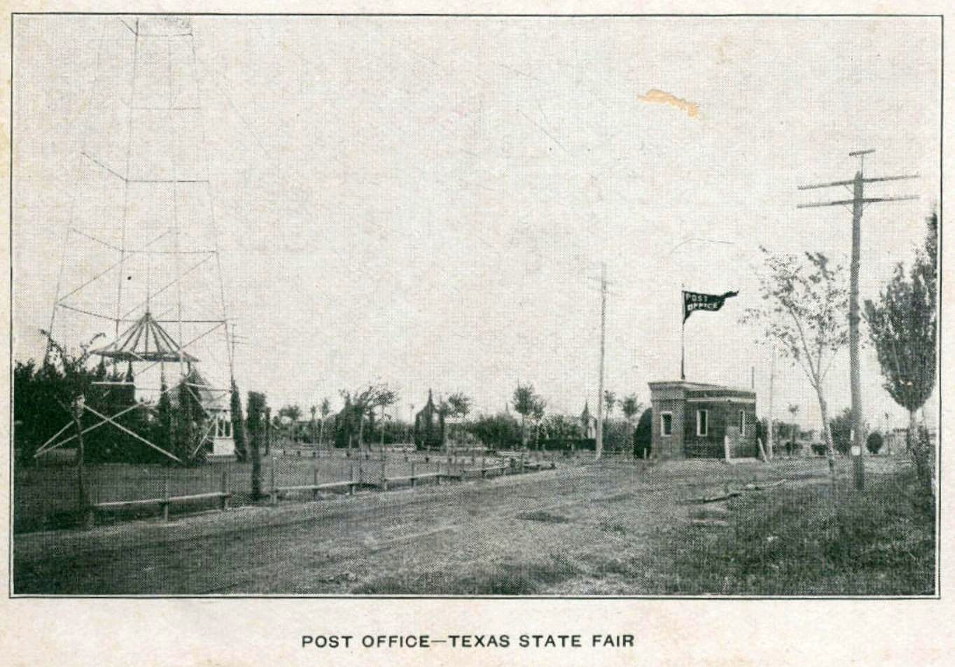 I’m not really sure about this. It’s a postcard with a photograph captioned “Post Office — Texas State Fair” on the front, and “Missouri, Kansas & Texas Ry. Co.” printed on the back.