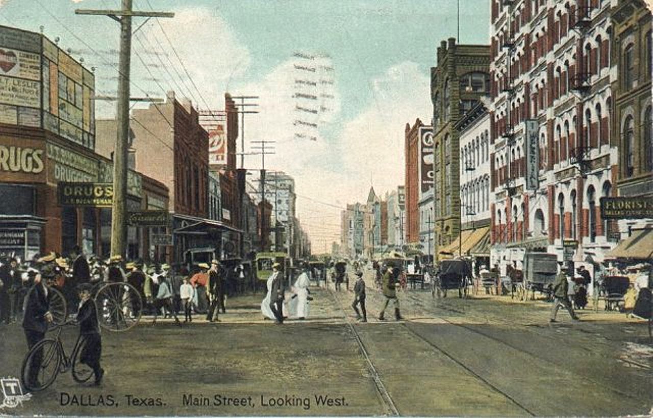 I first came across the image below in — of all places — a 1931 SMU yearbook and backtracked to finding the “color” postcard, above. The very grainy image (below) may just have been a black and white photo of this postcard rather than the original photograph, but it’s interesting to see them together. The yearbook identifies this as being Main and Akard, looking west on Main; it also dates it about 1906, but I think it’s earlier than that — there probably would have been evidence of automobiles on Main Street by then. Whenever it was, it seems like a pleasantly nostalgic frozen-in-time moment.