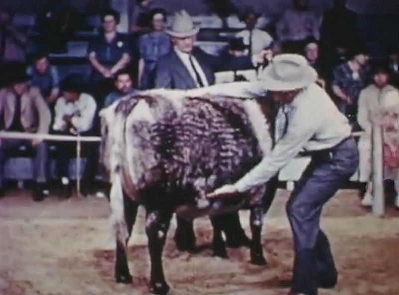 Harry and Charmayne went in and out of buildings, looked at different exhibits, rattled off facts-a-plenty, and extolled the greatness of Texas. And no way were they going to miss the livestock events. A state fair’s gotta have livestock. Like this almost perfectly rectangular Beef Shorthorn.
