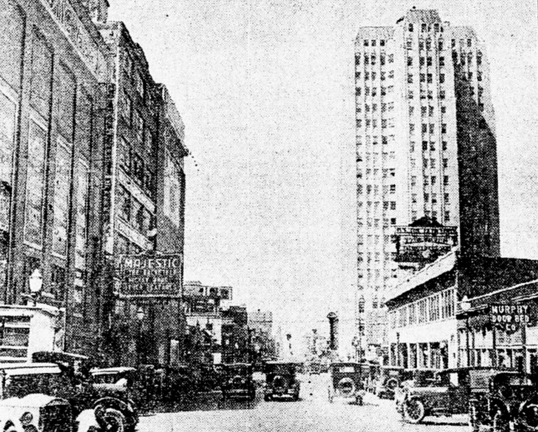 But back to the theaters. In the photo above, we see the Old Mill at 1525-27 Elm (where “The Snob” was playing, featuring John Gilbert and Norma Shearer), the Capitol at 1521-23 Elm (which had Alla Nazimova in “The Redeeming Sin”), and the Jefferson Theater at 1517 Elm (featuring Harley Sadler’s repertory company appearing in “Honest Hypocrites and Saintly Sinners” between vaudeville acts). All of these were playing in May, 1925.