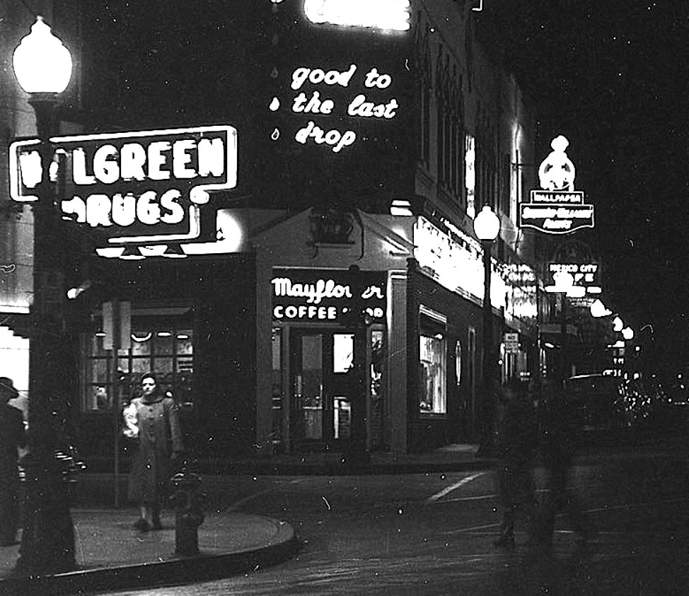 So many interesting things here: the Mayflower Coffee Shop (with its “Anytime Is Donut Time” clock and its animated Maxwell House Coffee sign), that incredible neon sign above the Lee Optical store which gave the forecast, that Fred Astaire Dance Studios sign (with “Astaire” in a fantastic neon font), and the Tower and Majestic theater signs lit up for moviegoers who ventured to the movies on a school night. Unseen: the public restrooms (or “public comfort stations”) hidden beneath the street, with the entrance (I think) on the Lee Optical triangular “corner.”