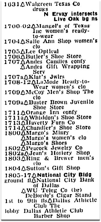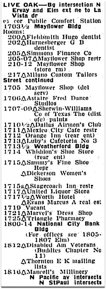 A listing of the businesses along Live Oak, between N. Ervay and N. St. Paul, from the 1953 city directory (click to read):