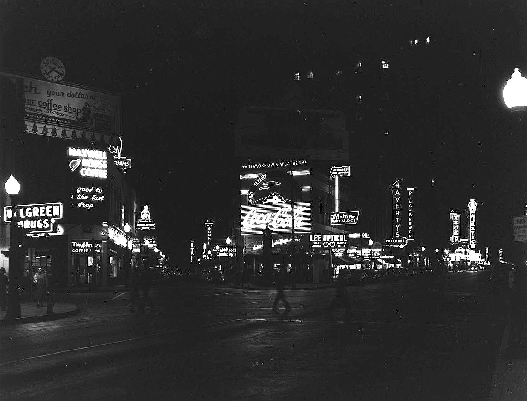 This photograph — an untitled night scene — was taken by Squire Haskins on Jan. 7, 1953; from the Squire Haskins Photography, Inc. Collection at the University of Texas at Arlington Libraries, Special Collections, accessible here.