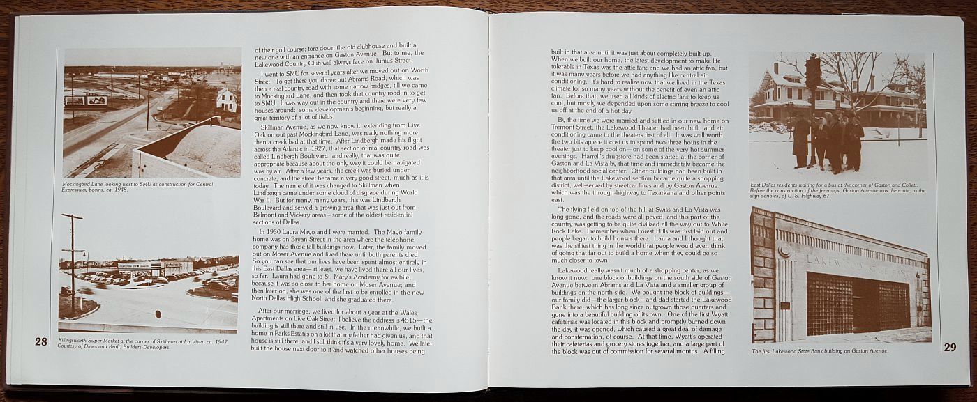 It contains over 150 historic photos of East Dallas and environs (most of which I’d never seen before) and more than 20 oral histories of the area from older folks who grew up or lived in Lakewood, Munger Place, Junius Heights, and other Old East Dallas neighborhoods (the oral histories are from the Lakewood Community Library Oral History Collection, which one may listen to at the downtown library or at the Lakewood Branch).
