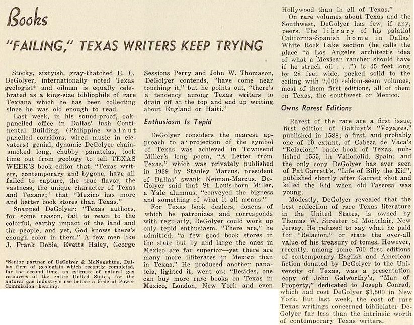 I’d give a dollar to know who wrote this interview with DeGolyer. The masthead of the August 31, 1946 issue of Teas Week lists Raymond Holbrook as editor and follows with a bunch of “contributing editors,” but no indication who the “book editor” might have been.