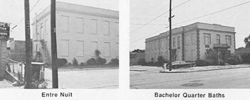 I saw this postcard for the Jones Eye, Ear, Nose and Throat Hospital and Clinic the other day. The only reason this jumped out at me was because I had researched the building a bit when I wrote about gay clubs in the ’70s for CentralTrack.com (“Hidden in Plain Sight: A Photo History of Dallas’ Gay Bars of the 1970s”). This non-descript, institutional-looking building started out life in 1928 as a fancy clinic at Live Oak and Hall, then became a gay bathhouse and bar (Bachelors Quarters and Entre Nuit), and it is now home to a CPA firm. (If those walls could talk….) I can’t update the Central Track post, so I thought I’d update it here. (Source: top image from the always amazing “Coltera” on Flickr; bottom photos from a 1975 issue of the gay travel magazine Ciao! More of these photos can be seen at the bottom of the Central Track article linked above.)