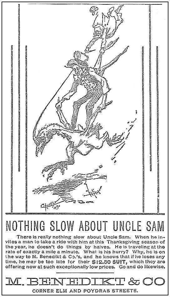 Men might have contemplated getting a new $12.50 suit from M. Benedikt & Co. (a suit which would cost about $335.00 today) — especially after seeing this eye-catching Uncle-Sam-riding-a-(scrawny)-turkey ad. (Click pictures to see larger images.)