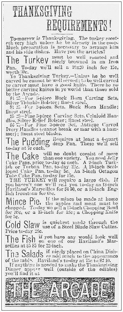 And stores that sold cookware, bakeware, and china took out ads to inform Dallasites that they really needed some new items in order to properly prepare for the big day — one’s guests shouldn’t be forced to be served a feast from tacky serving dishes or eat from chipped plates.