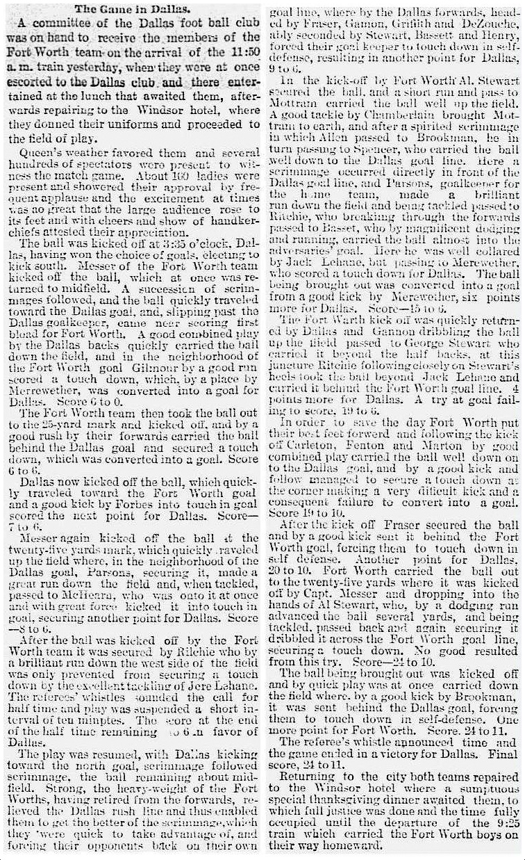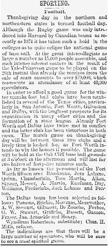 Dallas and Fort Worth had met twice before their matchup in Oak Cliff — both times with Dallas emerging victorious, and … not to be too anti-climactic, but the big inaugural Thanksgiving Day game on November 26, 1891 resulted in another Dallas win (24-11). (This shouldn’t be too surprising, seeing as the overwhelming majority of the players on the Dallas team of 15 grew up playing rugby in rugby-playing countries: 7 were British and 5 were Canadian — only 3 were native-born Americans. Still. Whatever it takes.) (The dullish play-by-play of the game can be read below.)