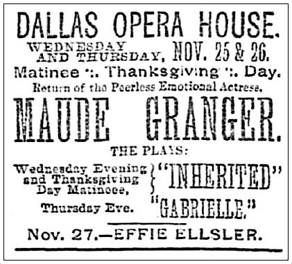 If one wasn’t spending Thanksgiving Day attending one of the city’s many church services, feeding the children at the Buckner Orphans Home, feeding one’s guests and one’s family, visiting friends, or trekking over to Oak Cliff to see that football game, he or she might have considered attending a matinee at the Dallas Opera House — Maude Granger (“The Peerless Emotional Actress”) was back in town and raring to emote.