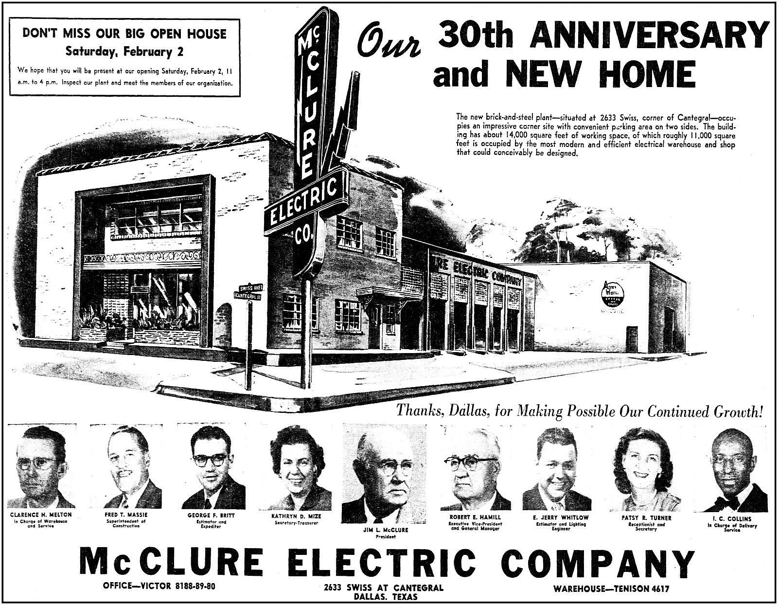 More on the McClure company’s grand opening at this Swiss Avenue location can be found in the Dallas Morning News article “McClure Electric Company at Home in Modern Plant” (DMN, Feb. 1, 1952).
