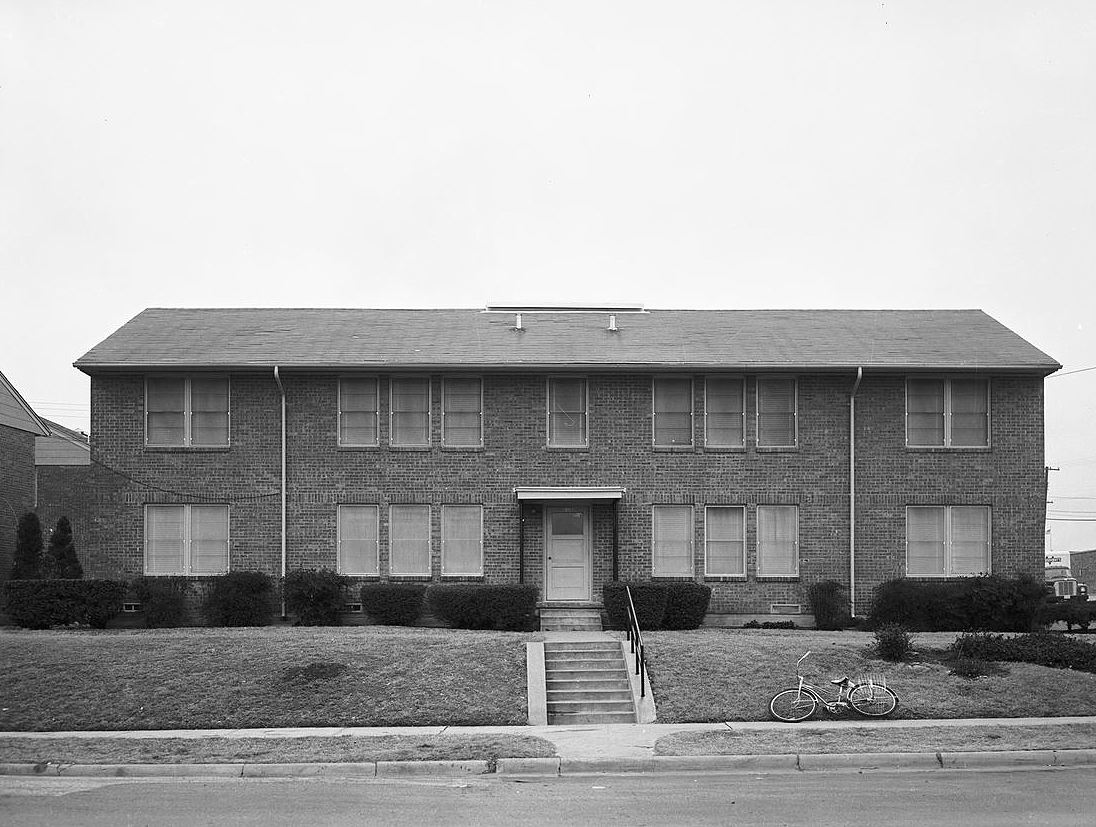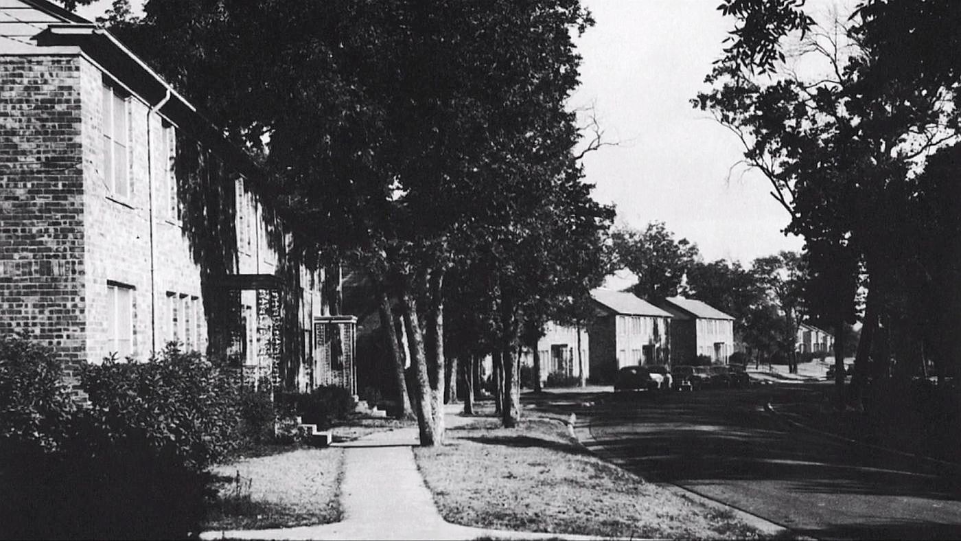 Wynnewood apartment buildings: with bike, taken by Squire Haskins on March 4, 1954, from the Squire Haskins Collection, UTA — more info here (click thumbnail on that page to see huge image). Second photo of Garden Apartments is a screenshot from the “Wynnewood North” film; Dallas Public Library photo.