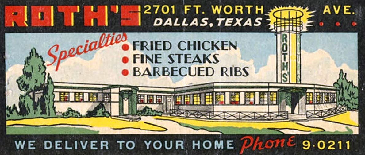 When I see a building like this, I always hope I can find a photo of it somewhere, but all I’ve been able to come up with is this energetic rendering from a 1940s matchbook cover. Roth’s (which was advertised variously as Roth’s Cafe, Roth’s Restaurant, and Roth’s Drive-In) was in Oak Cliff, on Fort Worth Avenue. It opened in about 1940 or ’41 and operated a surprisingly long time — until about 1967. When Roth’s opened, its address was 2701 Fort Worth Avenue, but around 1952 or ’53 the address became 2601. (I think the numbering might have changed rather than the business moving to a new location a block down the street.)