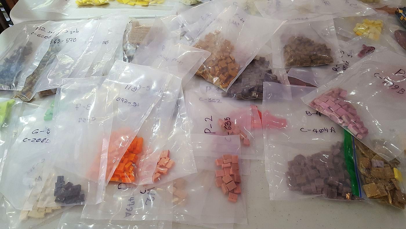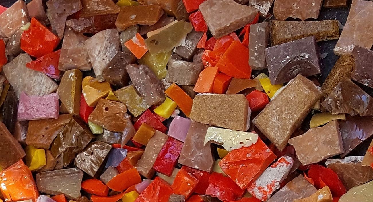 And smalti? Here are bags of “new” bagged tiles — not shown are the slabs or the larger pieces which look a little like brightly colored peanut brittle.