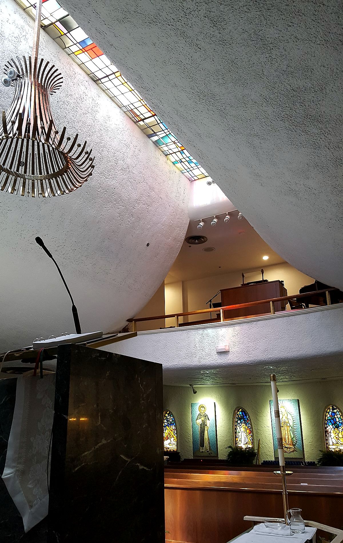 To your left is the altar. This lovely mosaic was also restored and cleaned. Also: curved walls, a stained glass skylight, and a light fixture that is one of my very favorite decorative elements of this chapel.