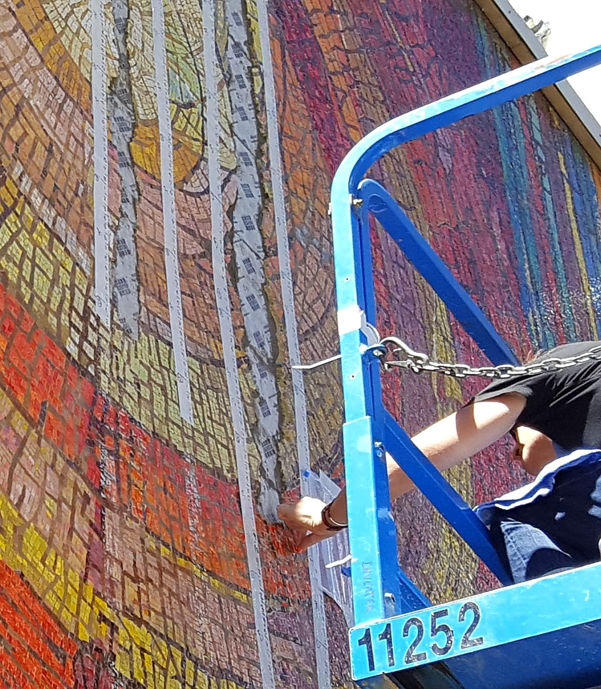 As you can imagine, the outdoor mosaic overlooking Main Street has, for 50 years, weathered everything from intense summer heat, freezing temperatures, automobile exhaust, slight shifting of the building’s structure, damage to individual tiles, mildew, grout decomposition, and a host of other factors, all of which led to the much-needed restoration work.