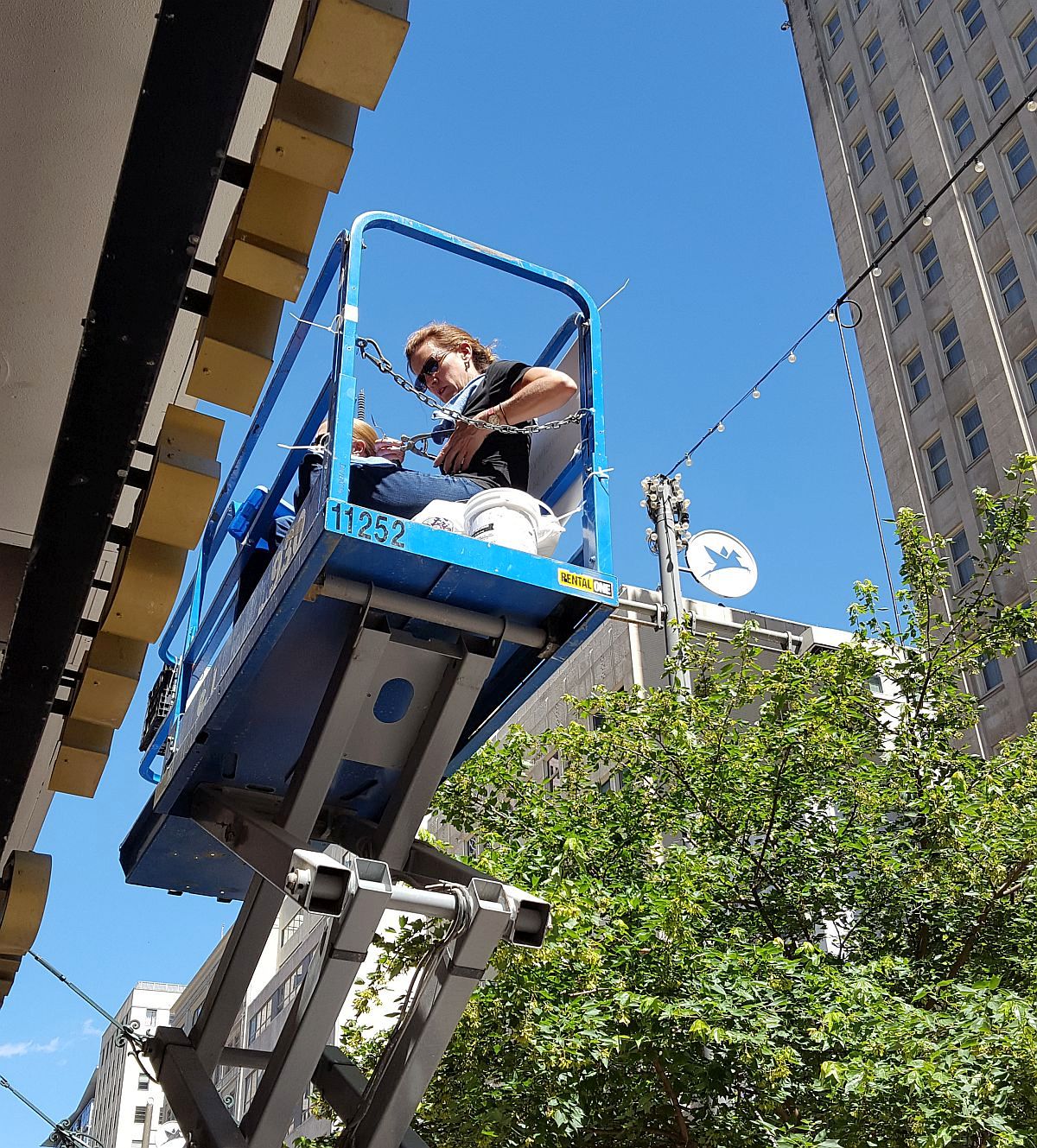 Julie asked if I wanted to go up on the lift and take a closer look. It was even more impressive (and a little overwhelming) to be right next to it. I also got to take a look over the top of the building. There Julie pointed out all that remains of one of downtown’s biggest and busiest retail stores, W. A. Green. I didn’t have the presence of mind to get a good photo up there, but here’s the “ghost sign,” seen from across the street.