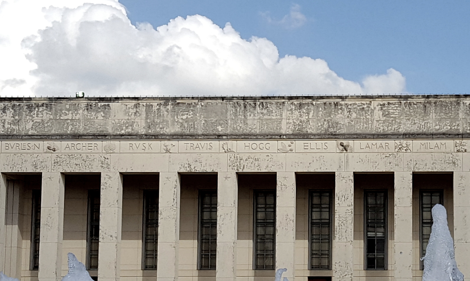 Around the top of the building is a frieze containing names of notable Texans. I’m sure a committee of some sort came up with this list of names which were carved into what was then the most expensive public building in Texas. All I can say is that it’s a shame they couldn’t have come up with just one more name — someone whose last name began with the letter “E,” because Mr. Barthelme arranged the first eight names to spell out his last name (which ended one letter too soon, at “M” — for Milam). I think if I had been in Barthelme’s position I might have just thrown in another name. Maybe “Erath.” …For closure. Click the photo below to see Mr. B’s winking historic signature.