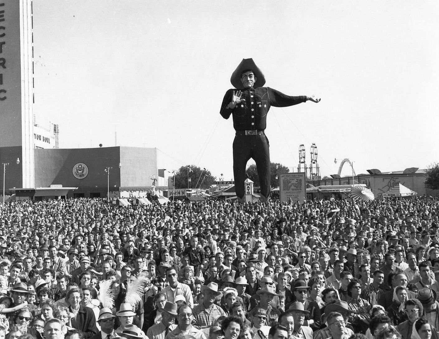 Big Tex and a crowd of serious-looking adults watch something in the distance at the 1959 State Fair of Texas.