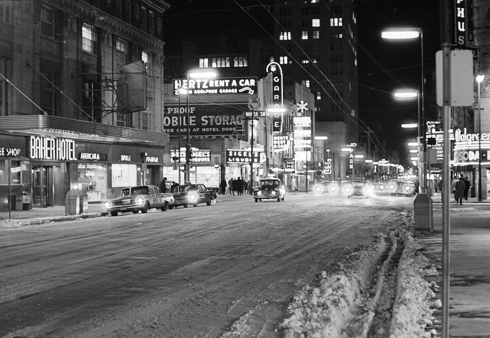 […] “canyon” is anchored at the south end by the Baker Hotel (behind the photographer), the Walgreens in the Adolphus Hotel building, and the Continental Air Lines ticket office in the Magnolia […]