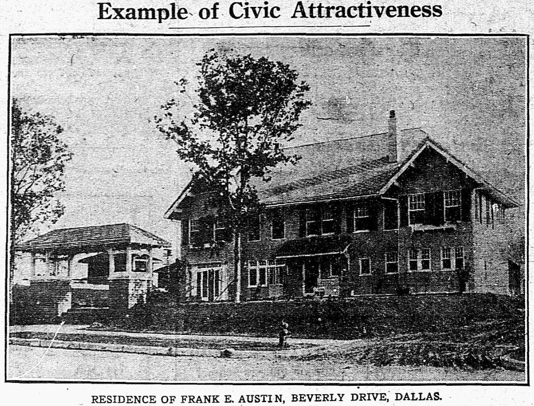 Residence 6: a house designed for bridge-builder FRANK E. AUSTIN, 4015 BEVERLY DRIVE, by architect Hal Thomson. It’s not terribly sexy, but the Dallas News dubbed it an “Example of Civic Attractiveness,” in November, 1913. Seems like the house is in dire need of a veranda (or at least a larger porch) to accommodate all that furniture. (See it on a 1921 Sanborn map, here.)