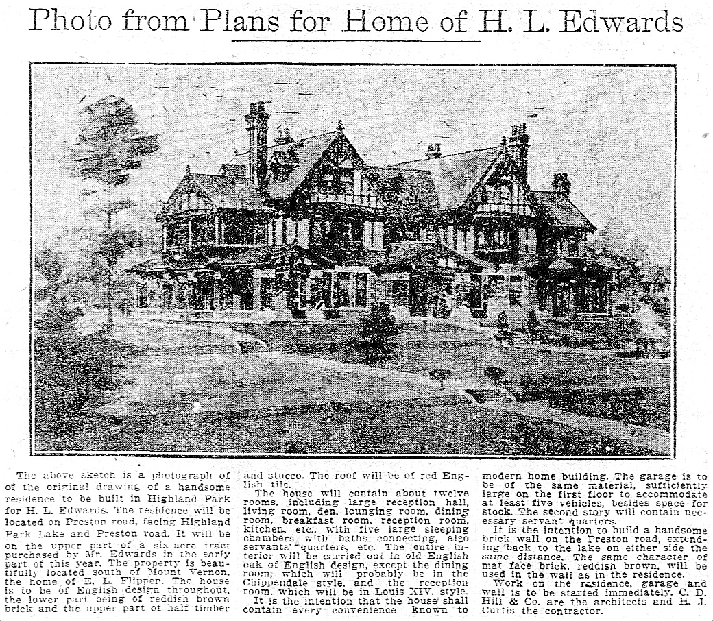 Residence 1: (above) the eye-wateringly beautiful HARRY L. EDWARDS estate, 4500 PRESTON ROAD, designed by architect C. D. Hill & Co., whose stunning Dallas Municipal Building/City Hall was under construction when this issue of The Western Architect was published. Edwards was a Welsh-born cotton tycoon who had been in Dallas since about 1899 and was said to have been the largest cotton buyer in the Southwest. And that was saying a lot — when cotton was king, money was no object, and Edwards spent a lot of money in the construction of his sprawling 6-acre estate. The house was perhaps most famously owned in later years by the late real estate mogul Trammel Crow, who purchased it in the early 1960s. If it looks vaguely familiar, you might have seen news footage of its recent demolition. …Um, yeah. (See the architect’s rendering and description of the not-yet-built “handsome residence” of H. L. Edwards, the “Prince of Cotton,” in a November, 1911 Dallas Morning News blurb, here.) (See this property on a 1921 Sanborn map, here — it is the second property north of Armstrong, just below the Highland Park Pumping Station. Note that these maps were issued a decade or so after most of the homes in this post were built — back then there were considerably fewer homes in Highland Park.)