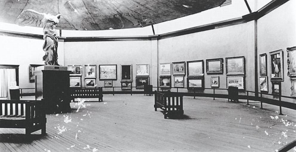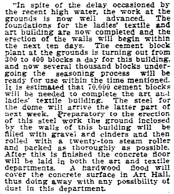 2. ART BUILDING, Fair Park, designed by Hubbell & Greene. Known as the Art & Ladies’ Textile Building when it was erected in 1908, this domed building gave Dallas its first public art museum. No longer would the 14 paintings owned by the Dallas Art Association (including works by Childe Hassam and Robert Henri) be relegated to being displayed (when staff was available) in a room in the public library. The building was initially built as a nod to “ladies” and was the place where textile crafts and artworks were displayed during the State Fair (Texas artist Julian Onderdonk was given the task of beating the bushes in New York City for works to be loaned for display in this building during the fair). The art gallery was set in the rotunda — a sort of gallery within a gallery — while textiles and other exhibits were shown in the outer area of the octagonal building. One interesting bit of trivia about the construction of this building is that it was built largely of cement blocks — 70,000, according to newspaper reports. In order to facilitate construction, a “cement block plant” was set up on the grounds in Fair Park, turning out hundreds of blocks a day, which were then laid out to “season” in the sun. (Incidentally, this building was under construction during the historic flood of 1908 — which the newspaper refers to as “the recent high water,” and the bad weather was slowing the construction process.) The building is no longer standing, but it seems to have lasted at least through the end of 1956. It stood just inside the Parry Avenue entrance, to the left, next to the Coliseum (now the Women’s Building) — the site is now occupied by a parking lot directly behind the D.A.R. house. (See it on a 1921 Sanborn map, here.)