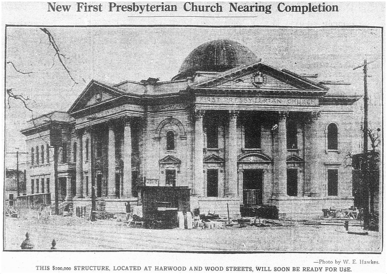 6. FIRST PRESBYTERIAN CHURCH, S. Harwood & Wood, designed by C. D. Hill. Built in 1911-12, this impressive building boasted “the largest monolith columns in the city” (a claim which might have been surpassed by architect Hill’s be-columned Municipal Building built soon after this church, two blocks away — and rivaled by Hubbell & Greene’s Scottish Rite temple, one block away). Still standing and much expanded, the church is still looking great. (See it on a 1921 Sanborn map, here.)