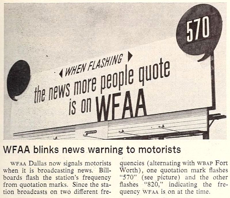 This 1963 photo of a billboard which instructed motorists which frequency WFAA was at that moment broadcasting on (it varied, depending on the time of day…) has been added to the post “WFAA & WBAP’s Unusual Broadcasting Alliance,” one of my favorite weird bits of trivia in Dallas radio history. (Source: Broadcasting magazine, April 22, 1963)