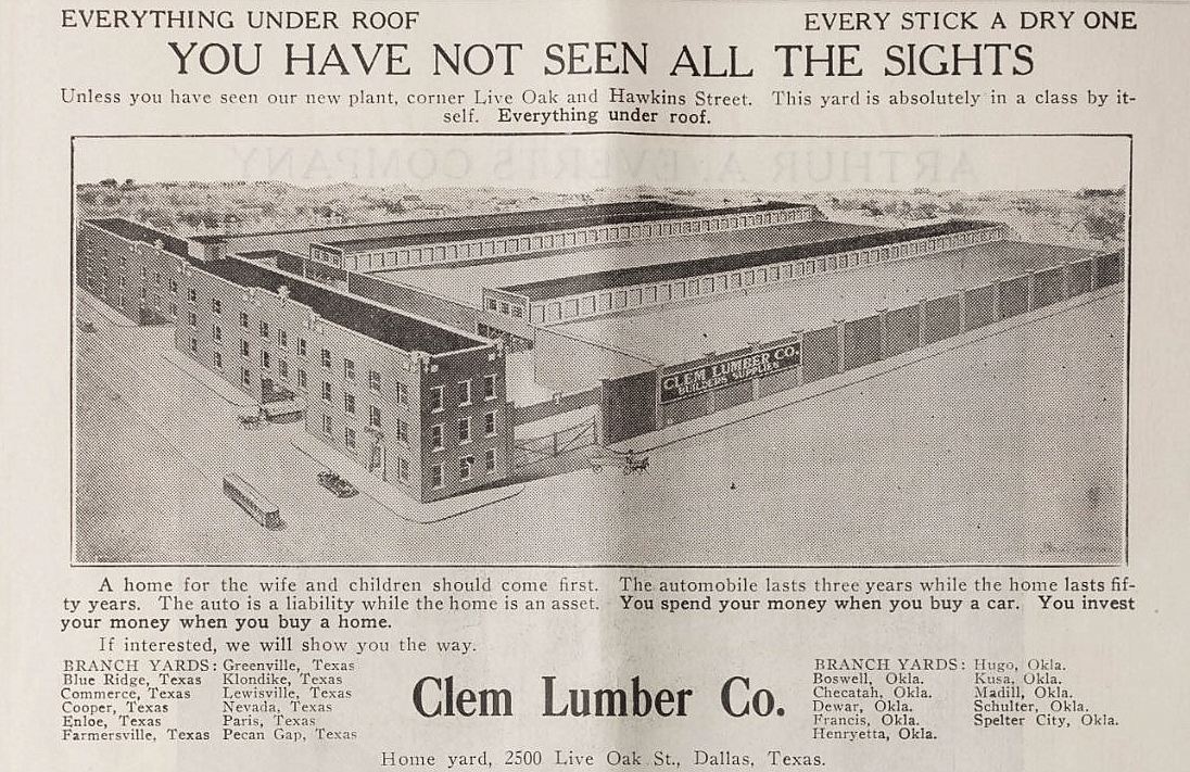 CLEM LUMBER CO., 2500 Live Oak (at Hawkins). “Every stick a dry one.”