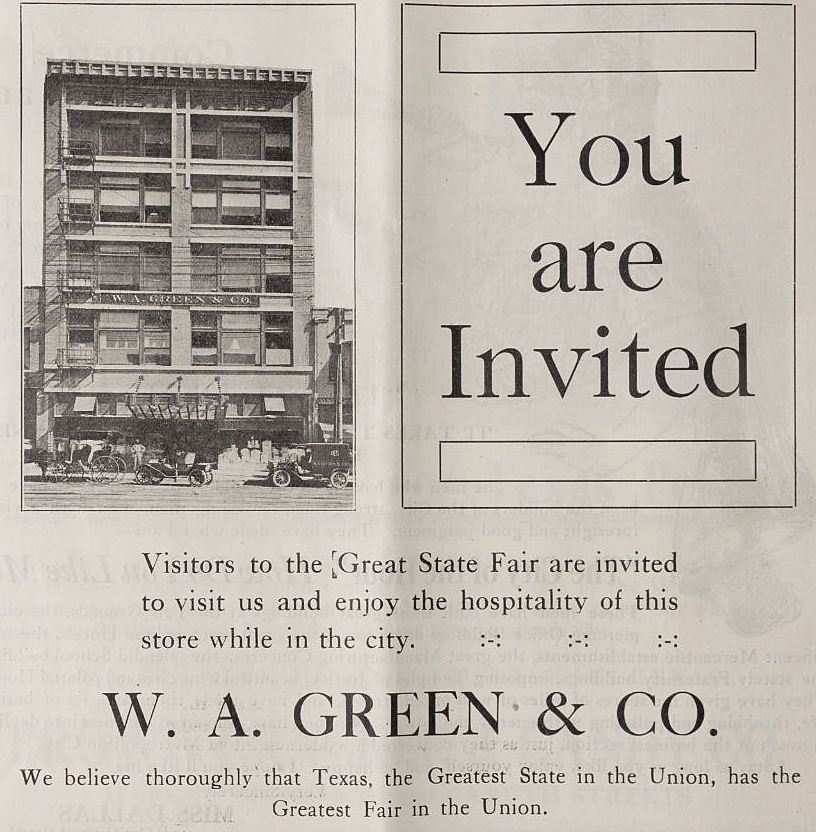 The ads in this post all appeared in a souvenir booklet, “Official Souvenir Program, State Fair of Texas: The Greatest Educational Institution in the Southwest, 1885-1916,” from the collection of the DeGolyer Library, SMU Libraries, Southern Methodist University — it can be accessed here.