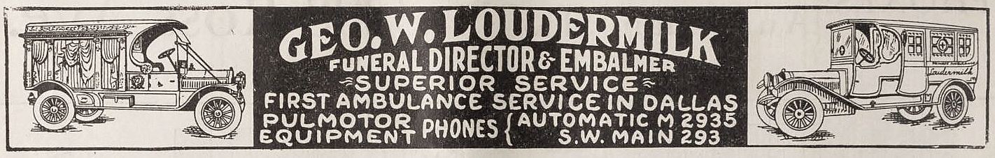 GEO. W. LOUDERMILK FUNERAL DIRECTOR & EMBALMBER, 1935 Main. “First ambulance service in Dallas.”