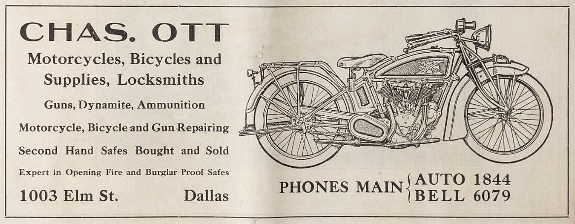 CHAS. OTT, Locksmith, etc., 1003 Elm. “Motorcycles, bicycles and supplies, locksmiths, guns, dynamite, ammunition […] second-hand safes.” Something for everyone! I wrote about Ott’s previously, here.