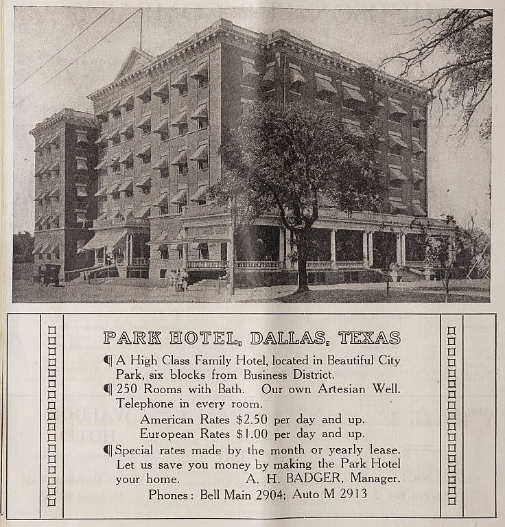 THE PARK HOTEL, 1312 S. Ervay. Known in recent years as the Ambassador Hotel (which burned down in 2019) (is anything going to be built on that land?), the Park Hotel, on the edge of lovely City Park, was “a High Class family hotel.”