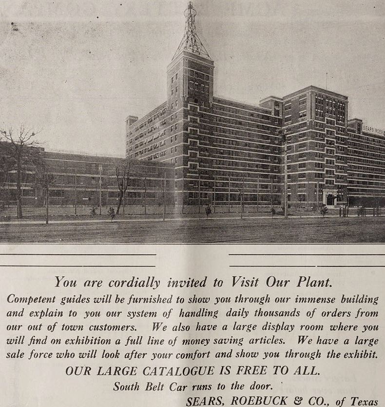 SEARS-ROEBUCK & CO., S. Lamar & Belleview. The “immense building” was built in stages between 1910 and 1913. Sears may be holding on for dear life in the 21st century, but its former HQ is thankfully still standing. (More here — scroll down to #10.)