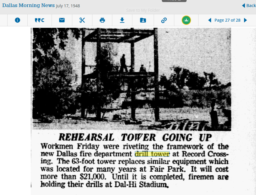 People may be more familiar with the DFD training tower at Record Crossing — see a photo of that at the Portal to Texas History, here.
