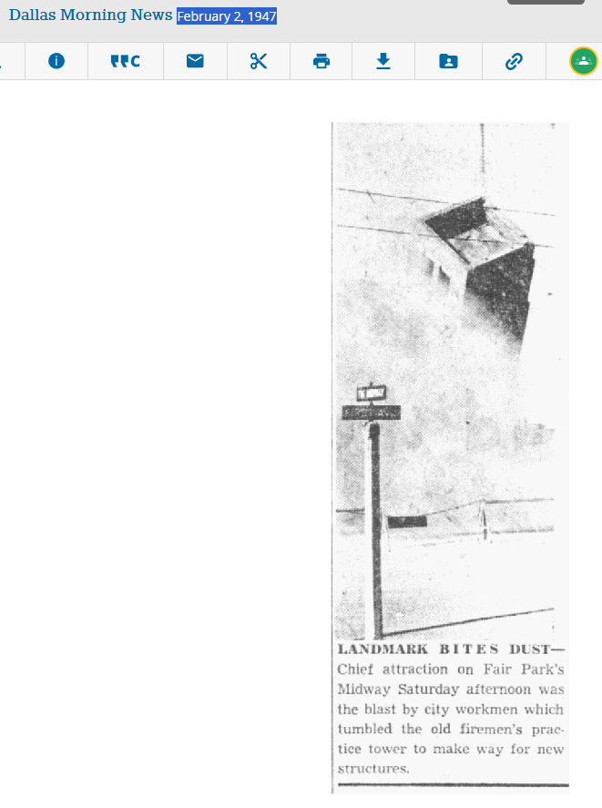 Thanks to the person commenting below, the tower was demolished on Feb. 1, 1947, “to make way for new structures” (DMN, “Landmark Bites Dust,” Feb. 2, 1947).