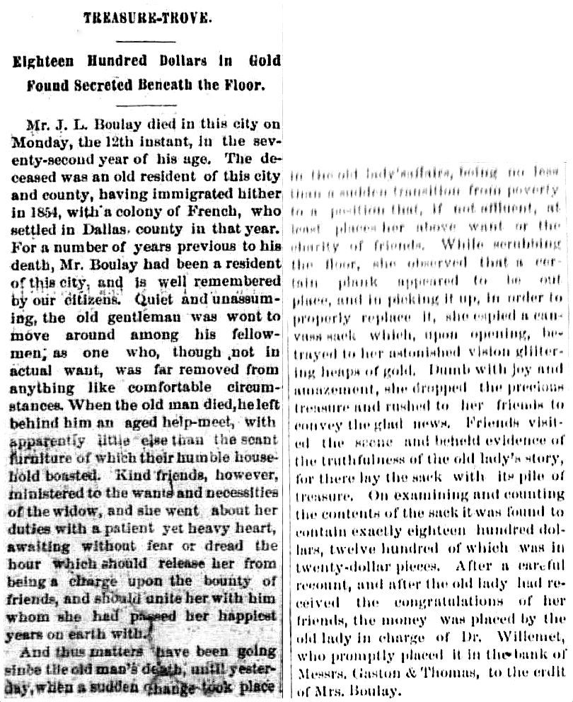 (Read about the surprise M. Boulay left his widow when he died in 1875, here, in an article from The Dallas Weekly Herald, July 24, 1875)