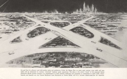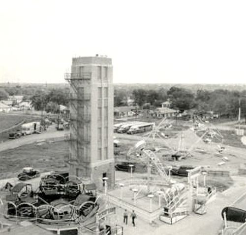 I posted the top photo to the Flashback Dallas Facebook page and asked about this tower thing, and I was informed that it was a drill tower, used by the fire department for training purposes. It was also used to demonstrate rescue practices during the fair. I was directed to this truly spectacular photo, which shows the tower on the far edge of Fair Park (slightly right of center, near the top of the photo — which, by the way, is HUGE). A detail is below.