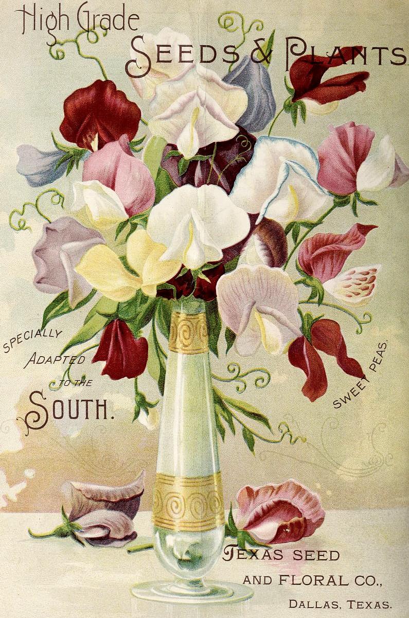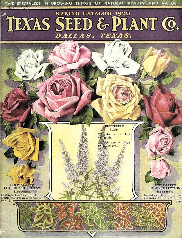 In honor of Spring’s arrival, I give you a collection of lovely illustrated covers from the Texas Seed & Floral Company’s seed catalogs. The company was established in Dallas around 1885 and was located for many years at the northwest corner of Elm and N. Ervay, with offices and a warehouse opening onto Pacific’s railroad tracks. (See photos of the interior of the business — later renamed Lone Star Seed & Floral — in the post “Next-Door Neighbors: The Palace Theater and Lone Star Seed & Floral — 1926.”)